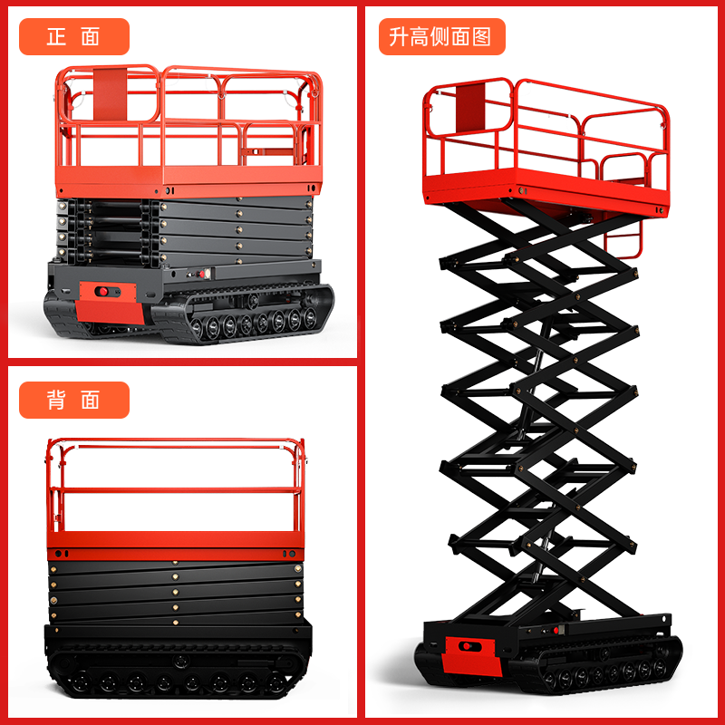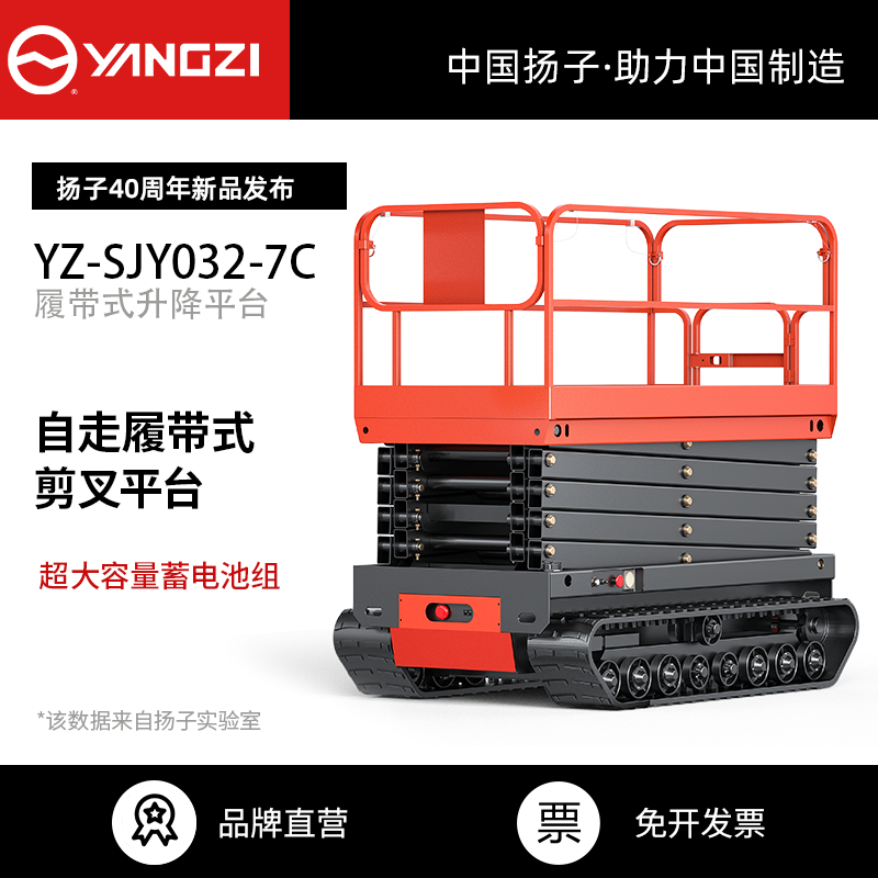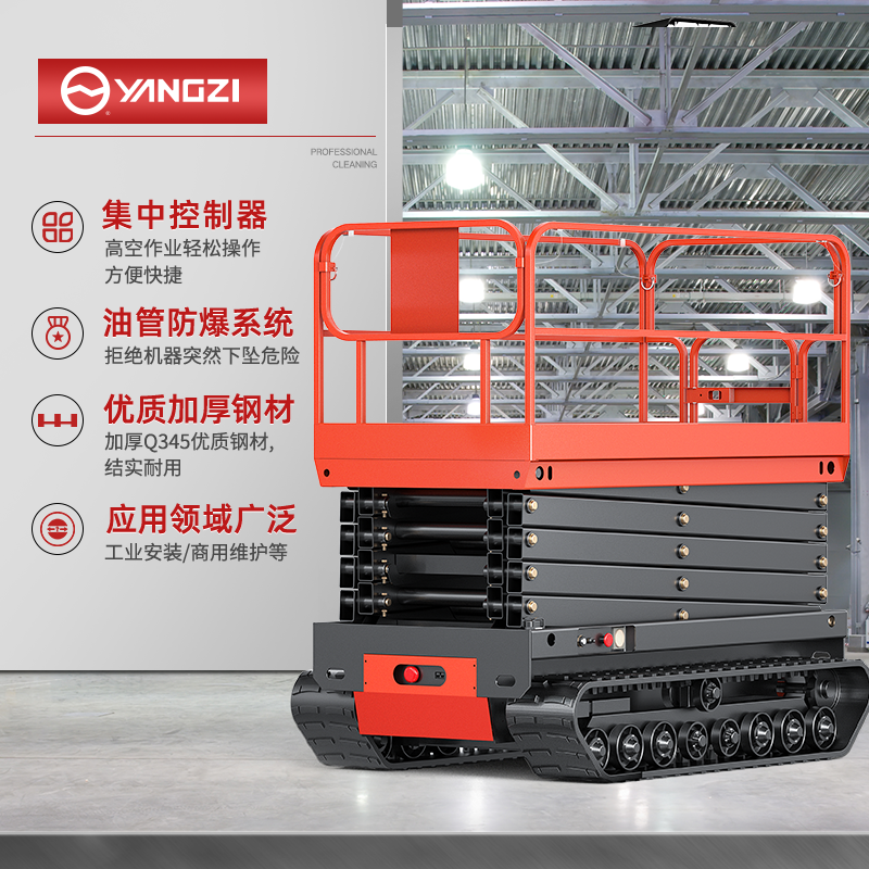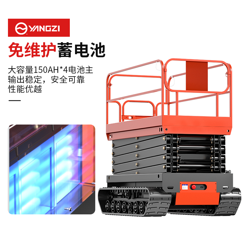 揚子履帶式升降平臺SJY032:跋山涉水,如履平地,安全承載,加固護(hù)欄,剪叉支架Q345優(yōu)質(zhì)鋼材,坦克式底座自由靈活,操作簡單,加厚鋼材,免維護(hù)電池。